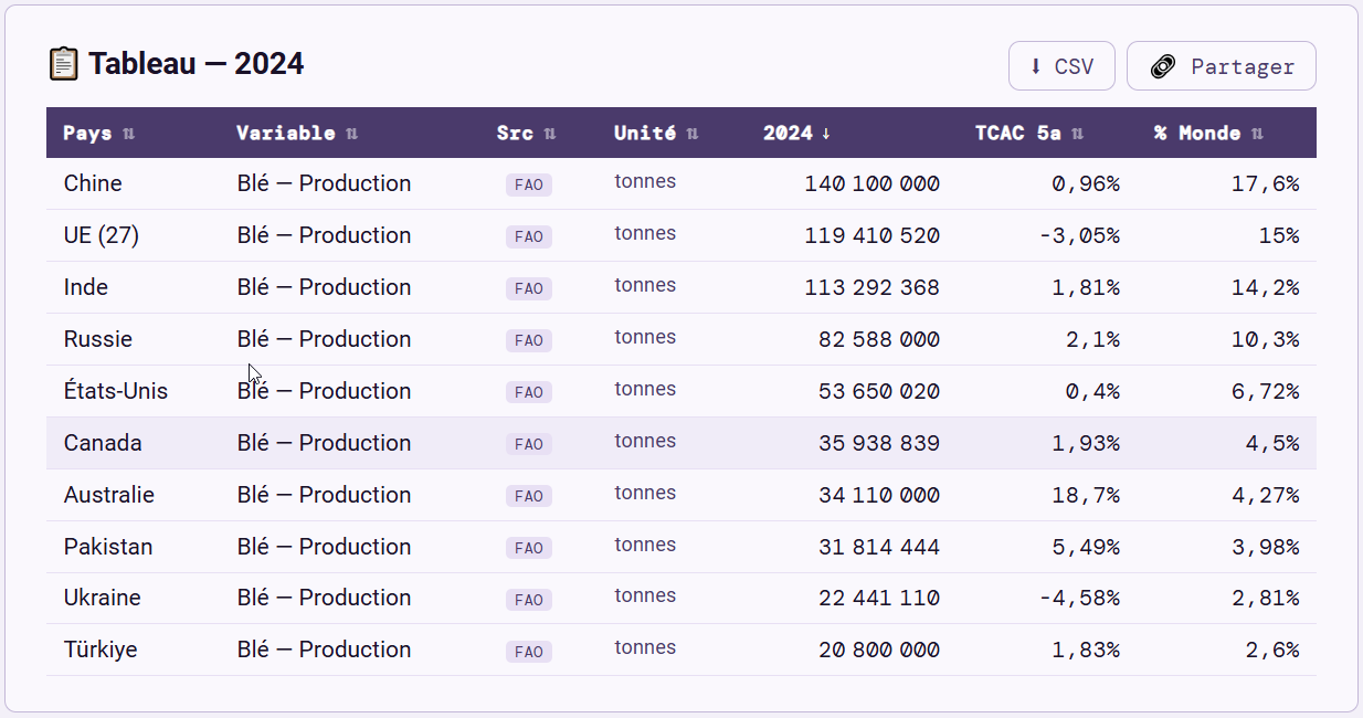 Contribution des principaux pays producteurs de blé. Comparaison entre les dix plus gros contributeurs en 2024 :