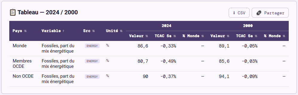 Analysons comment la part des fossiles dans le mix énergétique du Monde a changé entre 2000 et 2024 :
